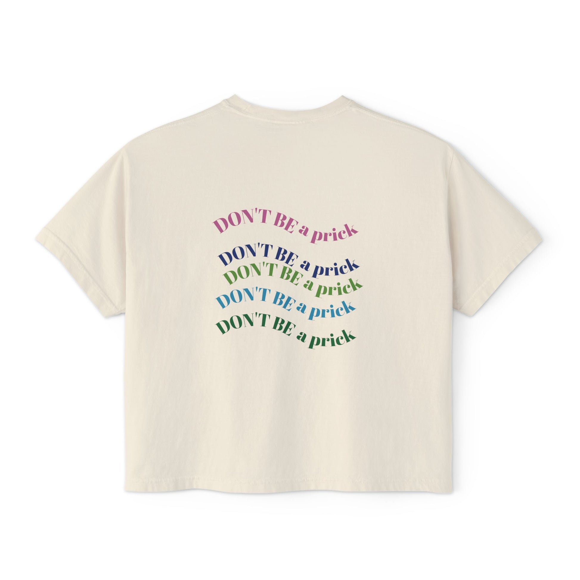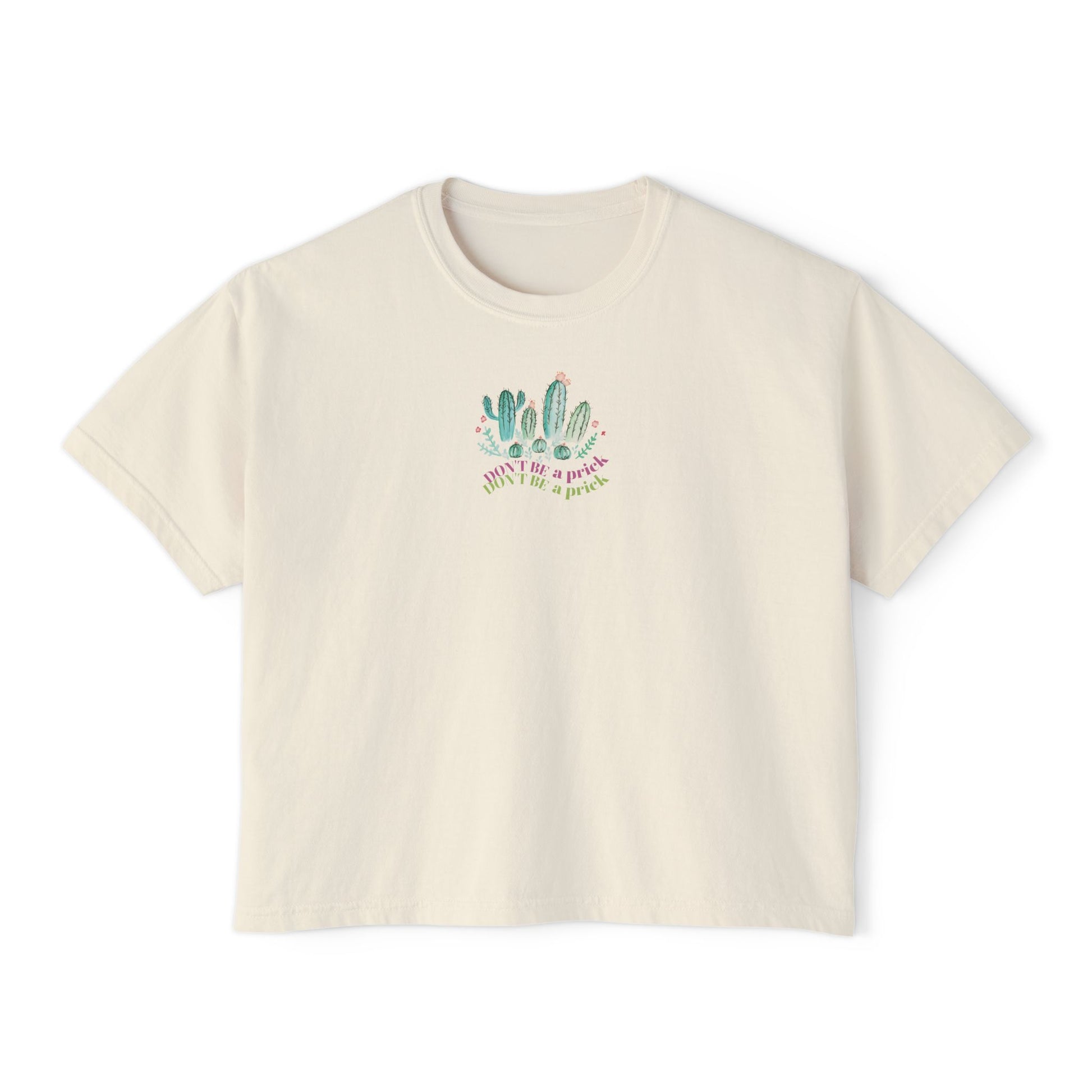 A funny cactus tee with the phrase 'Don't be a prick' printed on the front. Perfect for those who enjoy a touch of humor in their wardrobe. This boxy fit tee is made from 100% ring-spun cotton, providing a smooth and strong fabric for all-day comfort. Ideal for women looking to add a playful twist to their casual outfits.