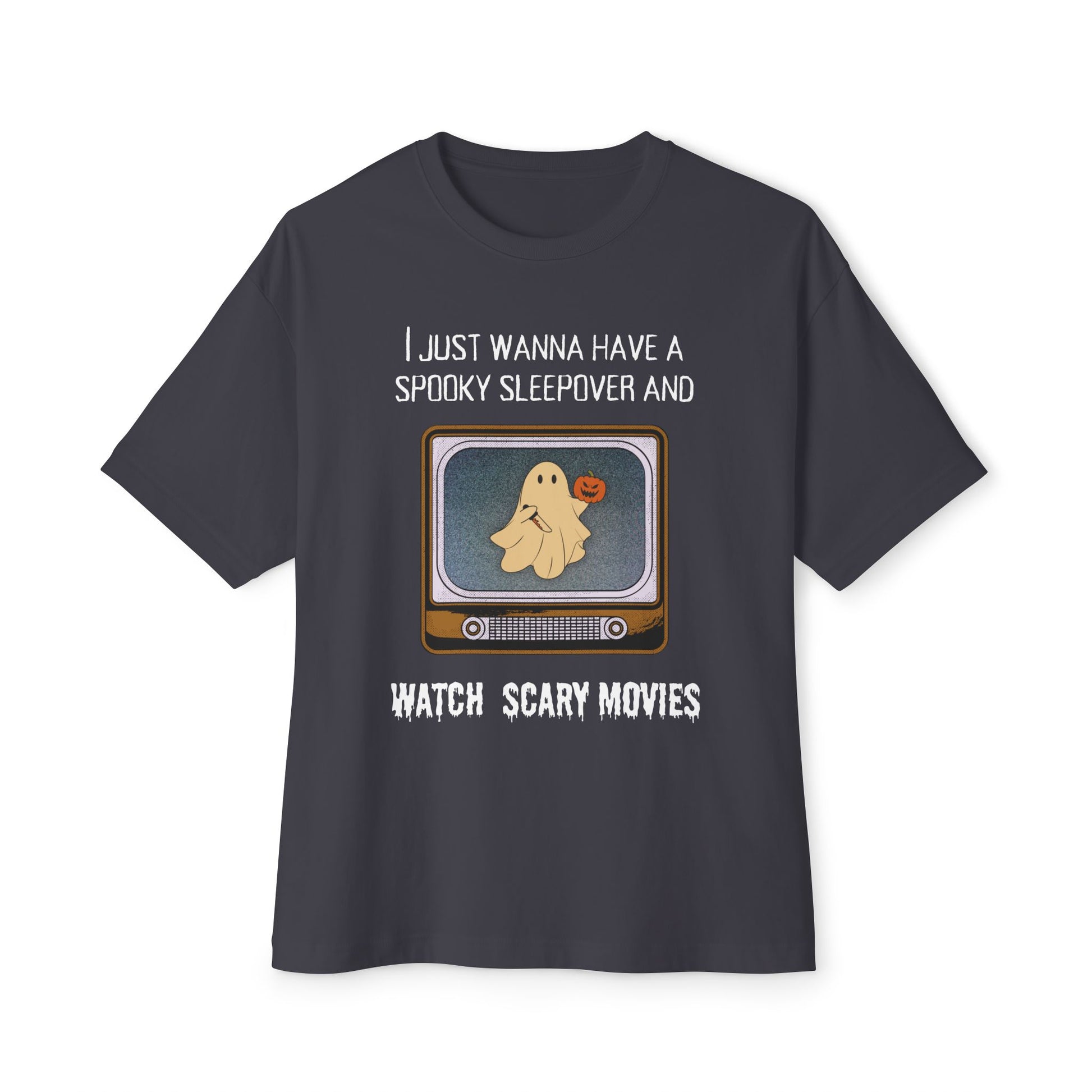 Unisex Oversized Boxy Tee - "I Just Wanna Have a Spooky Sleepover and Watch Scary Movies" for Halloween Fun, Cozy Movie Nights, Ghost [...]